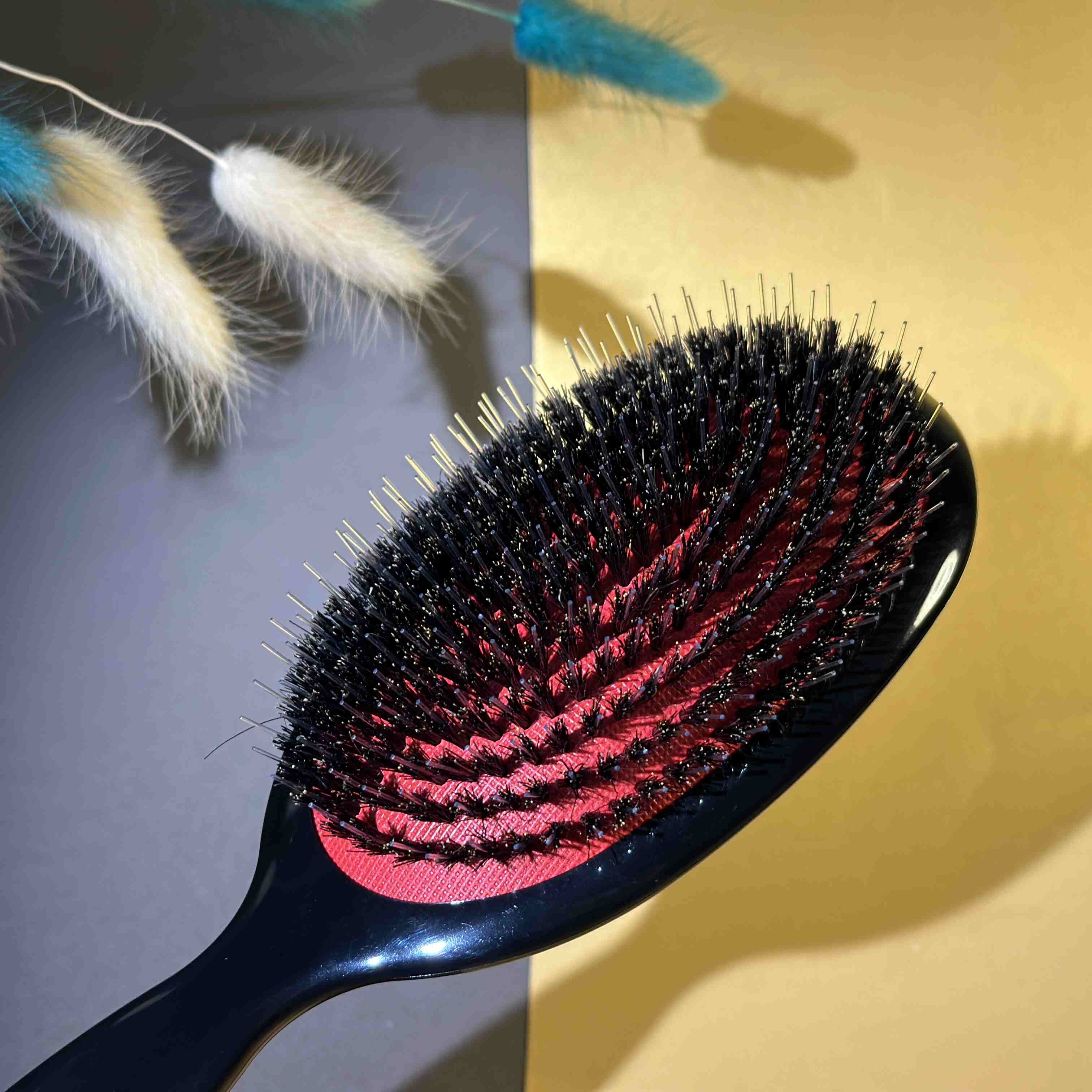 Специально разработана для наращенных волос, имеет два уровня щетины: первый верхний деликатно перебирает капсулы, второй – мягко и тщательно прочесывает волосы по длине, не травмируя волосы клиента, не повреждая крепление пряди.